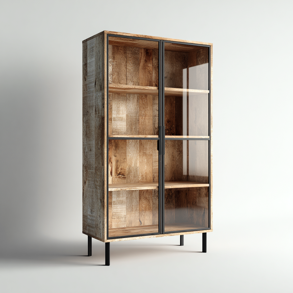 Vitrine bois et verre 90x40x185 cm - bois naturel - noir - pour cuisine - design industriel