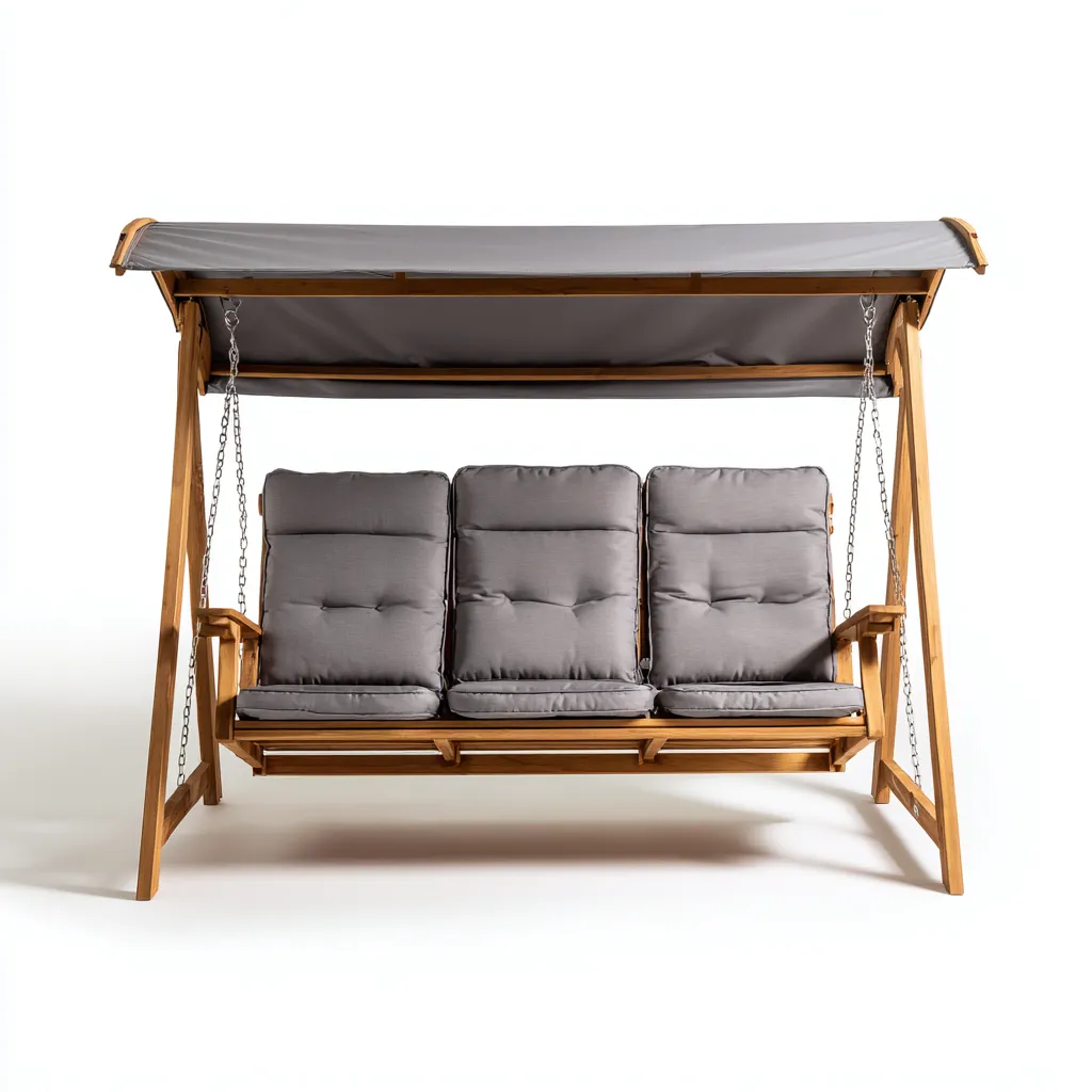 La balancelle offre un siège confortable équipé de coussins moelleux et d'un auvent qui procure une zone d'ombre appréciable. Les chaînes de suspension assurent un balancement fluide et stable pour des moments de détente.