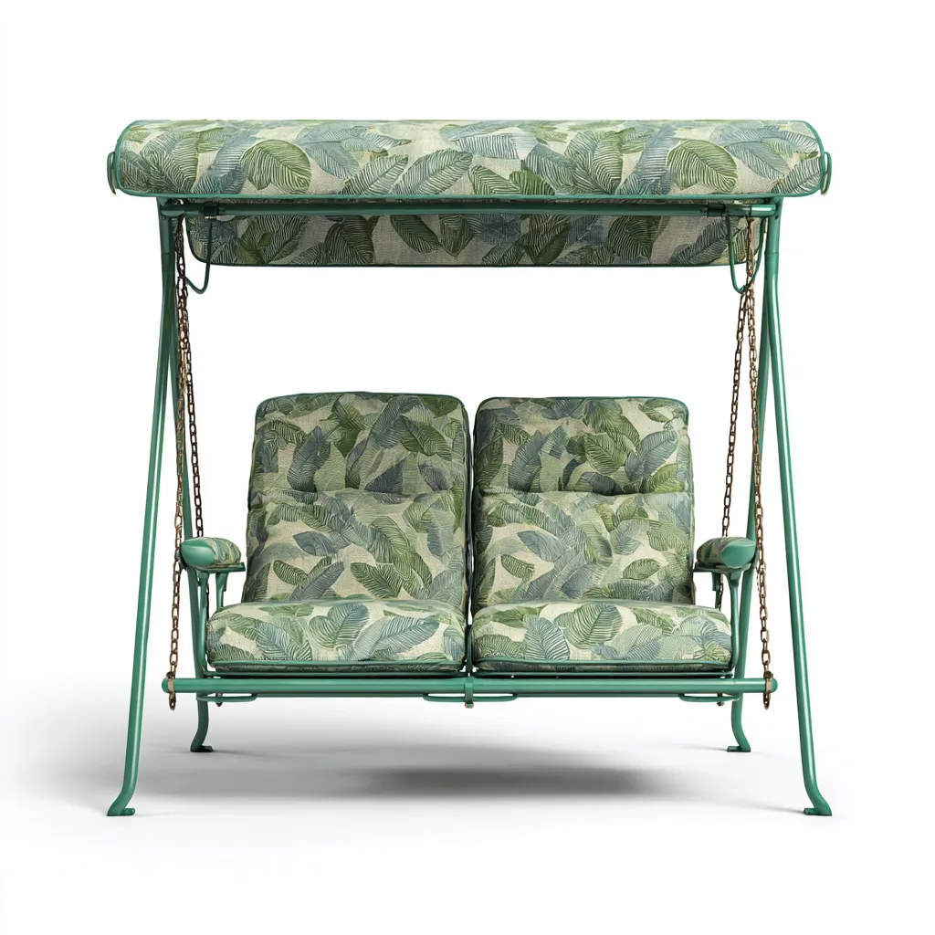 La balancelle associe une armature en métal vert à un tissu imprimé feuillage pour les coussins et l'auvent. Les matériaux sélectionnés résistent à une utilisation extérieure et conservent leur aspect décoratif au fil du temps.