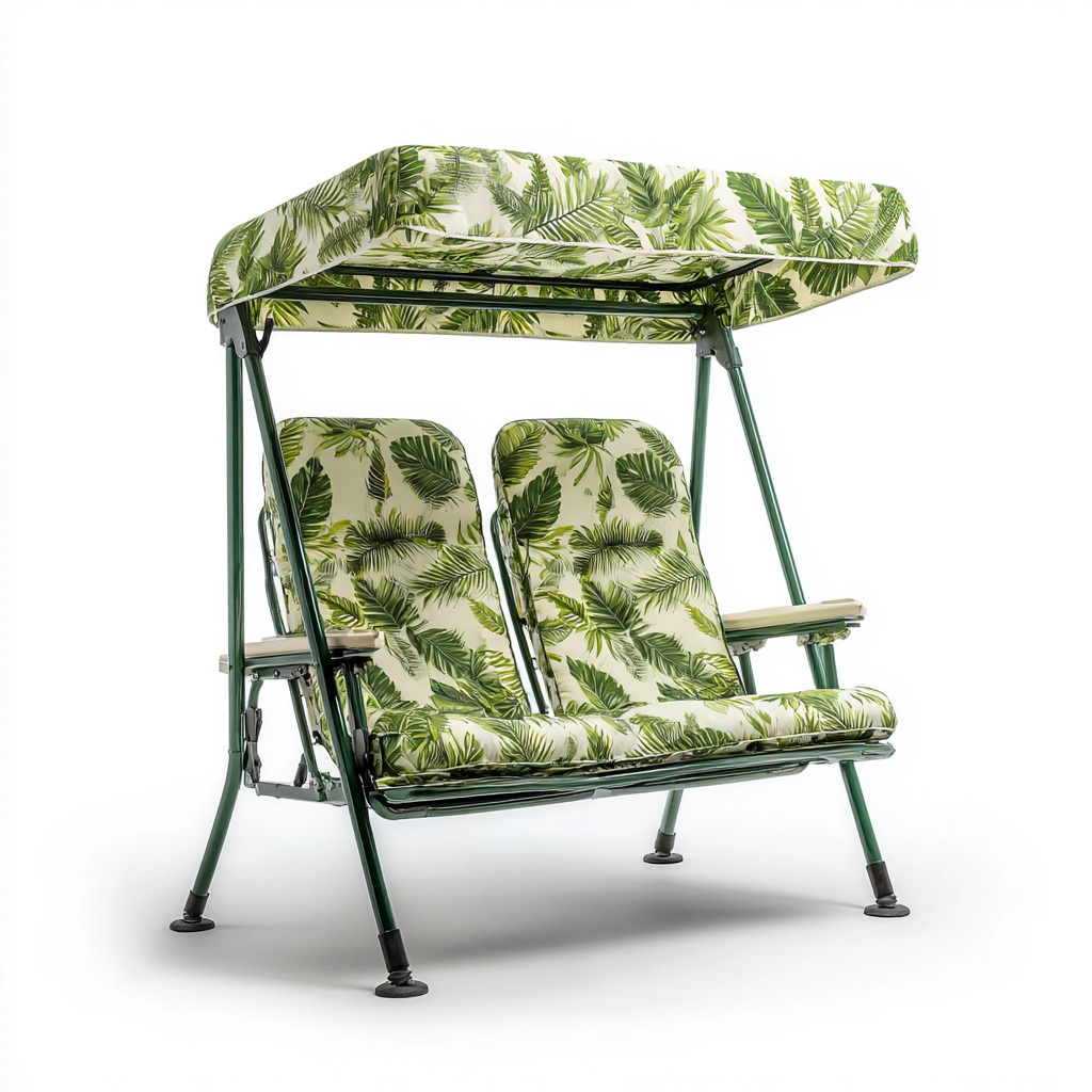 La balancelle est fabriquée avec une armature en métal vert associée à un tissu imprimé tropical pour les coussins et l'auvent. Les matériaux sont conçus pour résister aux conditions extérieures tout en conservant un aspect décoratif.