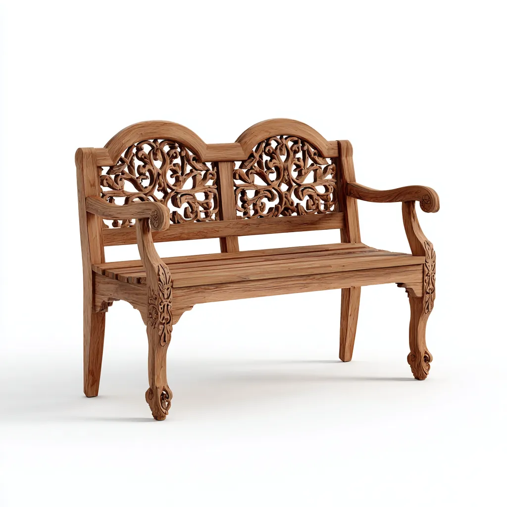 Fabriqué en bois naturel, le banc met en valeur les variations du matériau et bénéficie de finitions sculptées réalisées avec soin. La teinte bois naturel permet une intégration harmonieuse dans un jardin ou une terrasse.