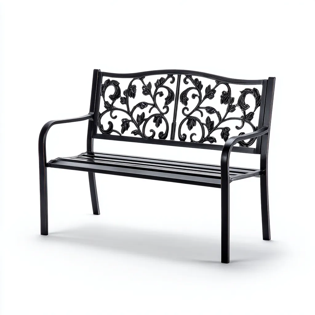 Entièrement fabriqué en métal avec une finition noire, le banc bénéficie d'une bonne résistance aux intempéries. Le dossier ajouré finement travaillé renforce son charme traditionnel tout en assurant un soutien confortable.