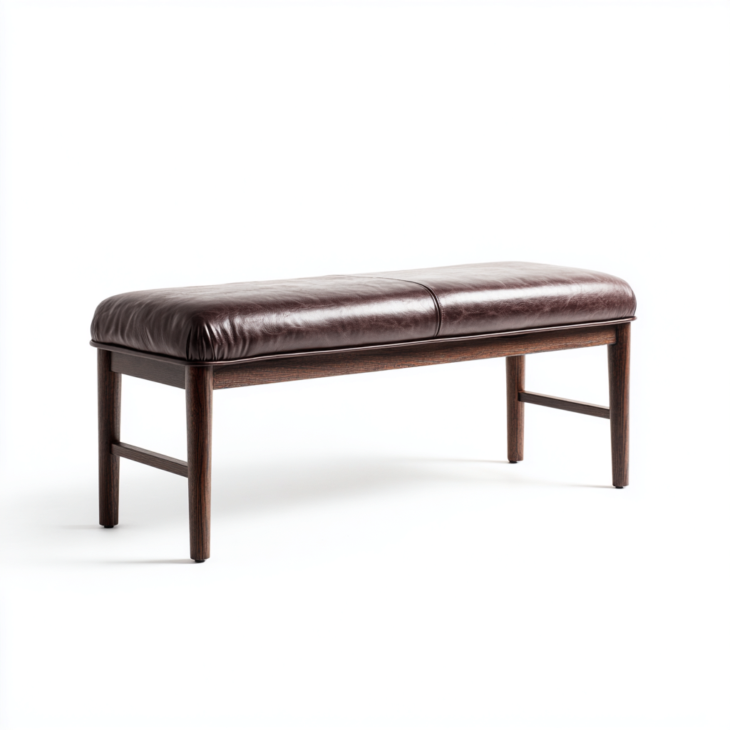 Le banc est conçu avec un revêtement en cuir marron souple et une structure en bois solide. La surface lisse et légèrement capitonnée met en valeur la qualité du revêtement et assure une sensation agréable au toucher.