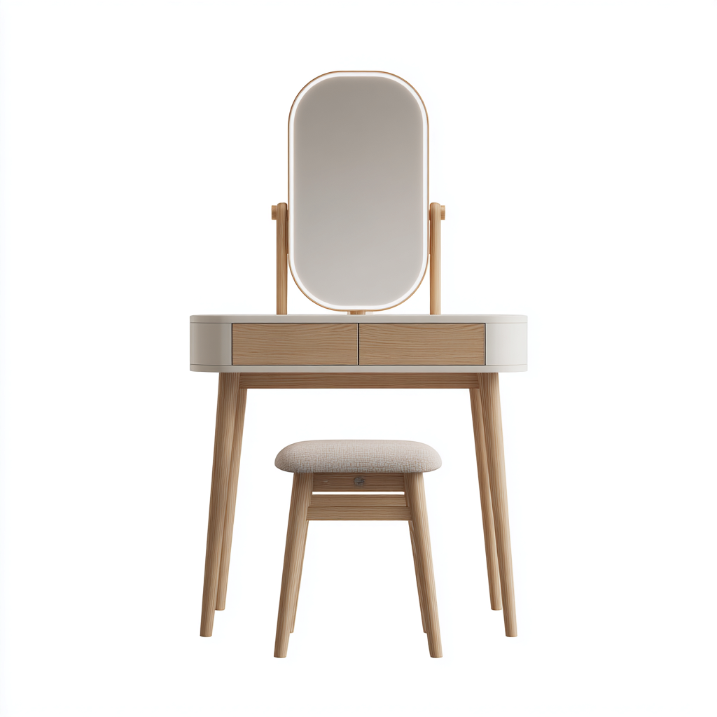La coiffeuse associe une structure en bois finition chêne clair à des éléments blancs pour une esthétique lumineuse et moderne. Le miroir ovale dispose d'un éclairage intégré, tandis que le tabouret assorti est doté d'une assise rembourrée confortable.