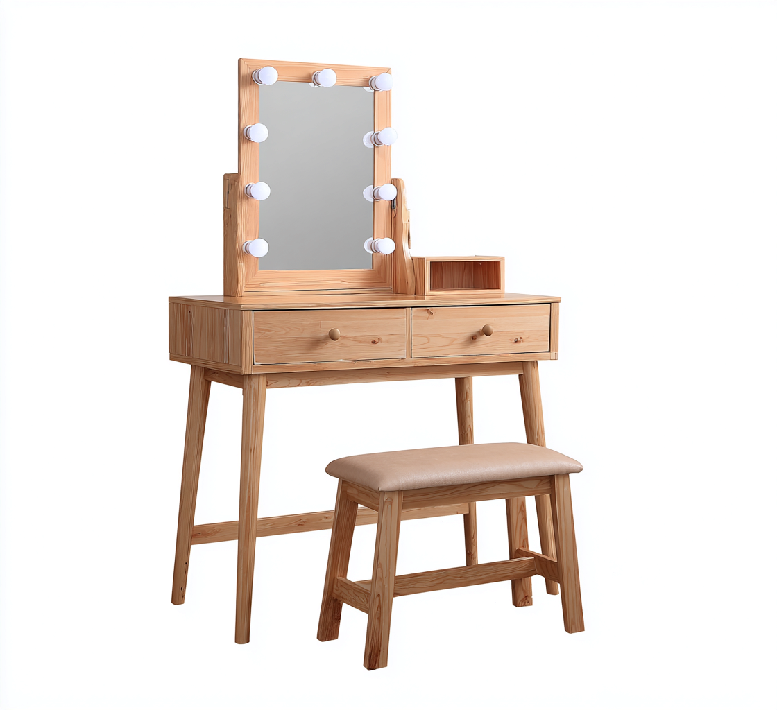 La structure est réalisée en bois massif couleur bois clair, apportant une ambiance naturelle et chaleureuse. Le miroir est équipé de lampes offrant une luminosité adaptée au maquillage. Le tabouret assorti est doté d'une assise rembourrée pour un confort optimal.