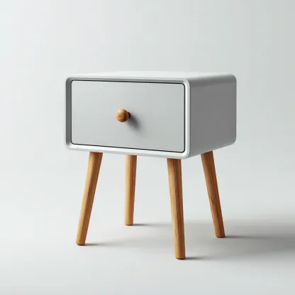 Le corps du meuble est réalisé en MDF blanc avec une finition lisse, tandis que les pieds en bois naturel offrent stabilité et chaleur visuelle. La poignée ronde en bois complète l'esthétique minimaliste.