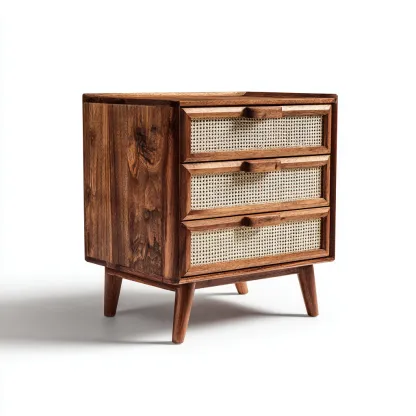 Cette commode en bois naturel associée à des façades en rotin tressé offre un style vintage chaleureux. Elle constitue une solution de rangement compacte et élégante adaptée à différents espaces intérieurs.