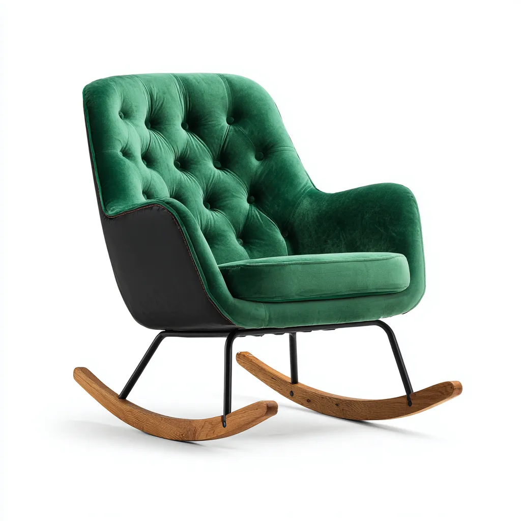 Le siège est revêtu de velours doux au toucher, soutenu par une structure en métal noir assurant stabilité. Les patins de bascule en bois massif garantissent un mouvement fluide et agréable.
