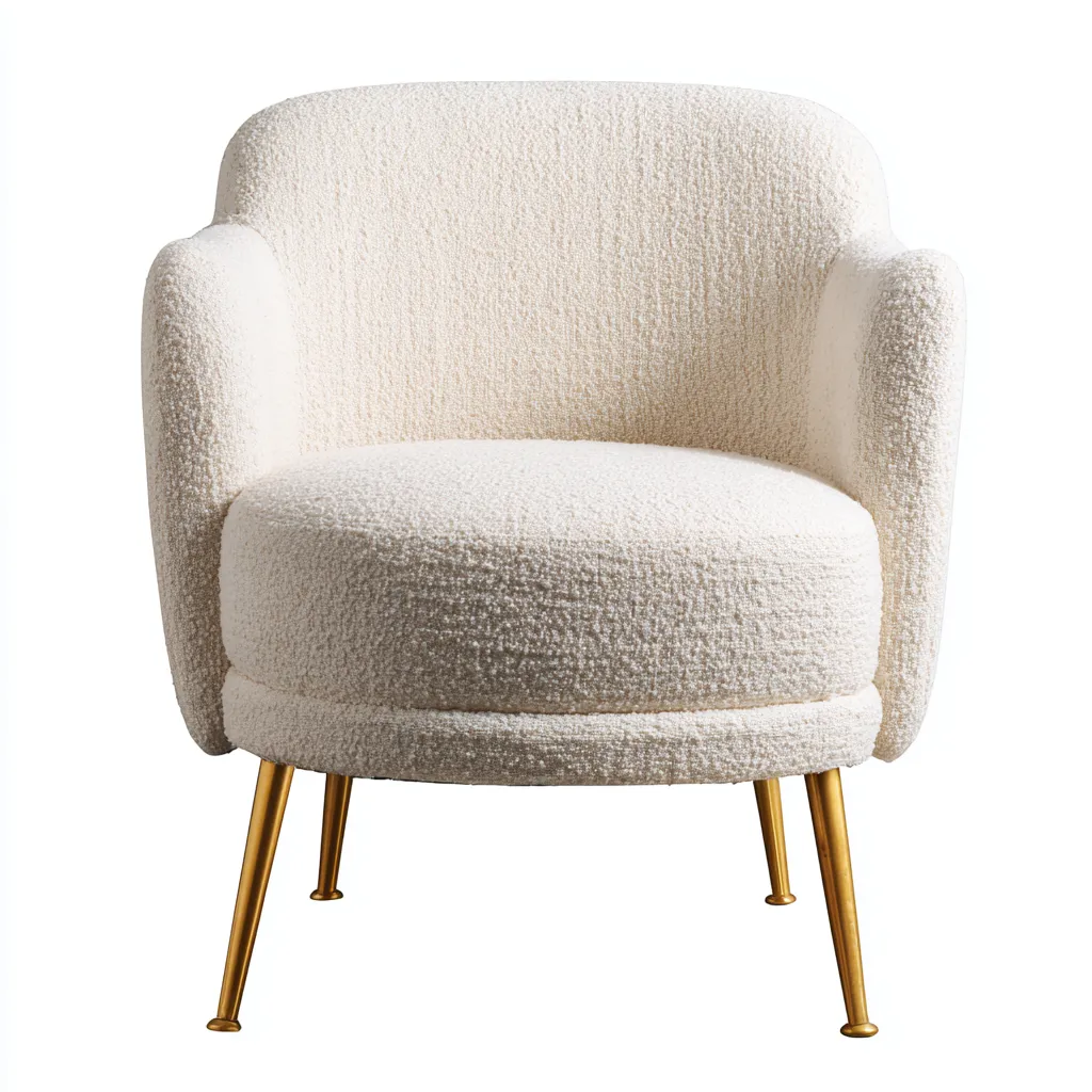 Le revêtement en tissu bouclé crème offre une texture douce au toucher, tandis que la structure interne assure une bonne stabilité. Les pieds métalliques finition dorée ajoutent une touche contemporaine et élégante.