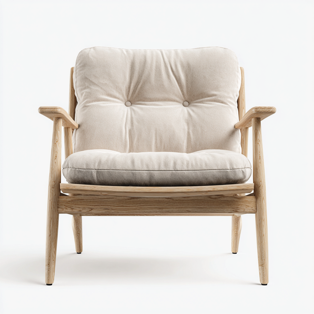 Ce fauteuil en tissu beige au style nordique est conçu pour offrir une assise confortable dans le salon. Sa structure en bois naturel combinée au coussin rembourré crée une atmosphère chaleureuse et accueillante.