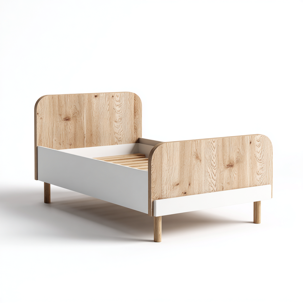 Le lit dispose d'une tête et d'un pied arrondis en chêne clair, apportant douceur visuelle et sécurité. Sa conception légère et stable facilite son intégration dans une chambre d'enfant.