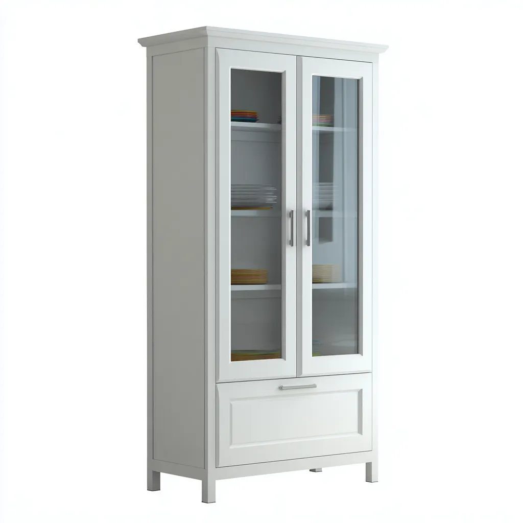 Le meuble est réalisé en bois avec une finition blanche nette. Les portes intègrent des panneaux en verre transparent et des poignées métalliques pour une ouverture confortable.