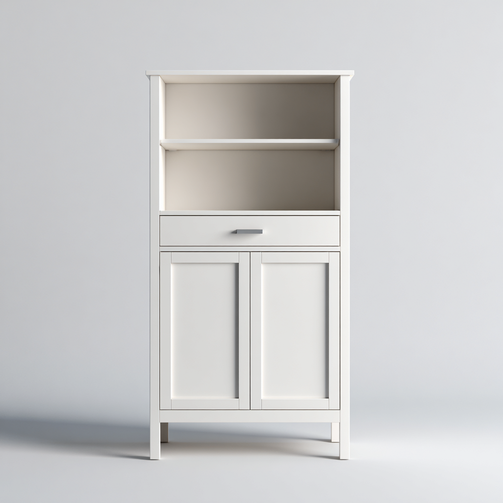Le meuble dispose d'une étagère ouverte, d'un tiroir pratique et d'un espace fermé par deux portes, permettant de ranger et d'organiser facilement les objets du quotidien.