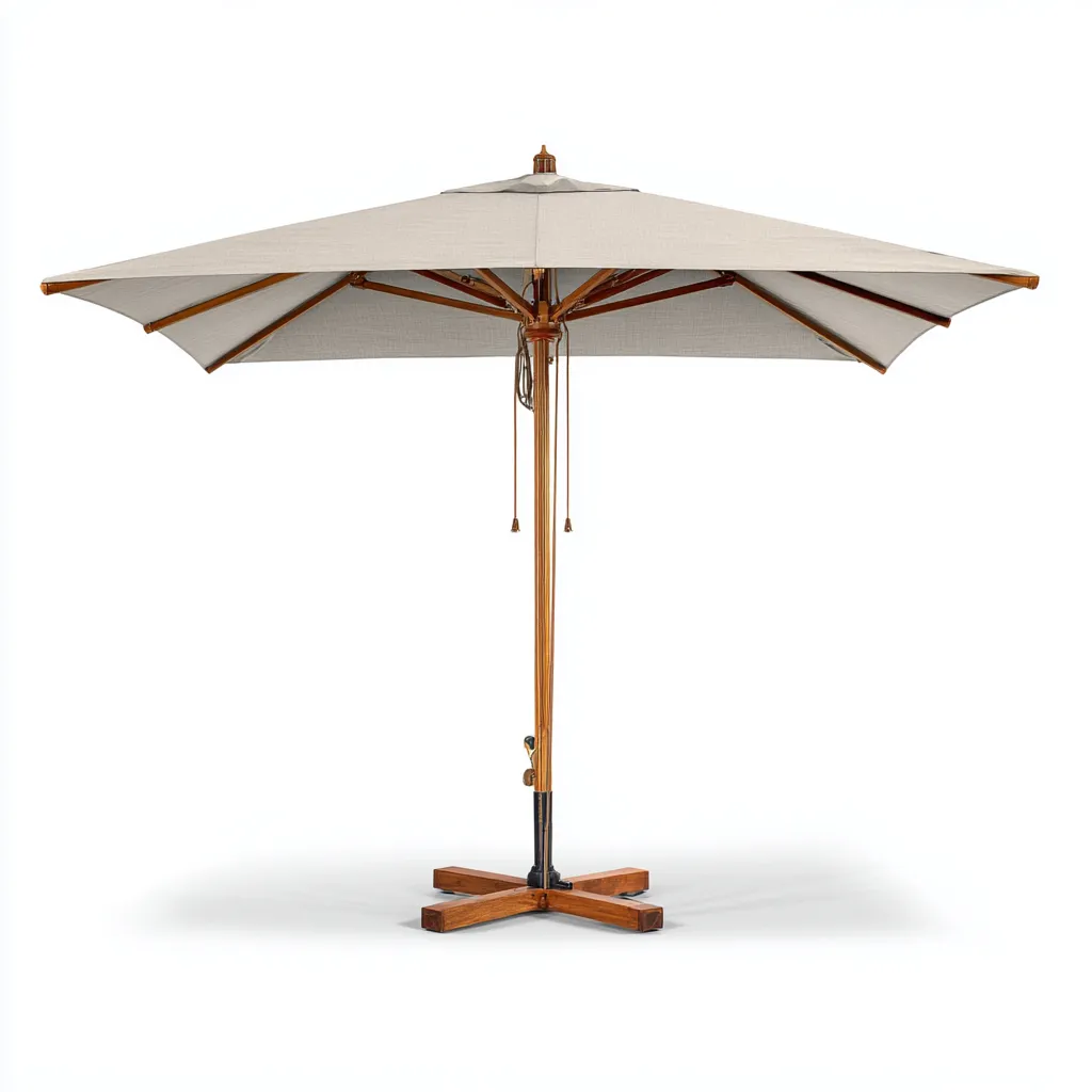 La toile est réalisée en polyester résistant, assurant une bonne protection contre le soleil. Le mât et les baleines sont en bois, apportant robustesse et stabilité tout en renforçant l'esthétique naturelle de l'ensemble.