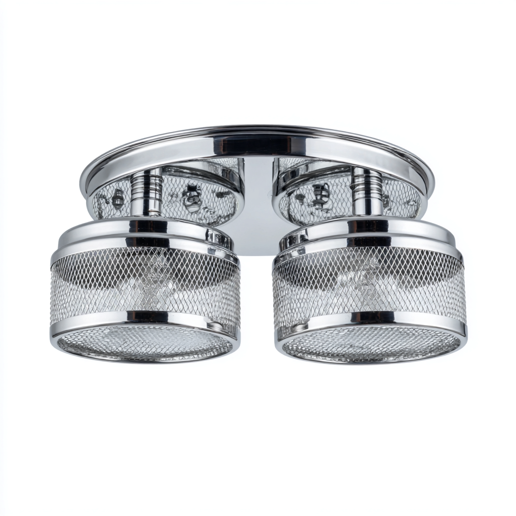 Ce plafonnier en métal chromé présente une apparence moderne et épurée. Ses deux diffuseurs cylindriques en grille métallique assurent un effet visuel unique et une diffusion lumineuse efficace pour un salon ou une entrée.