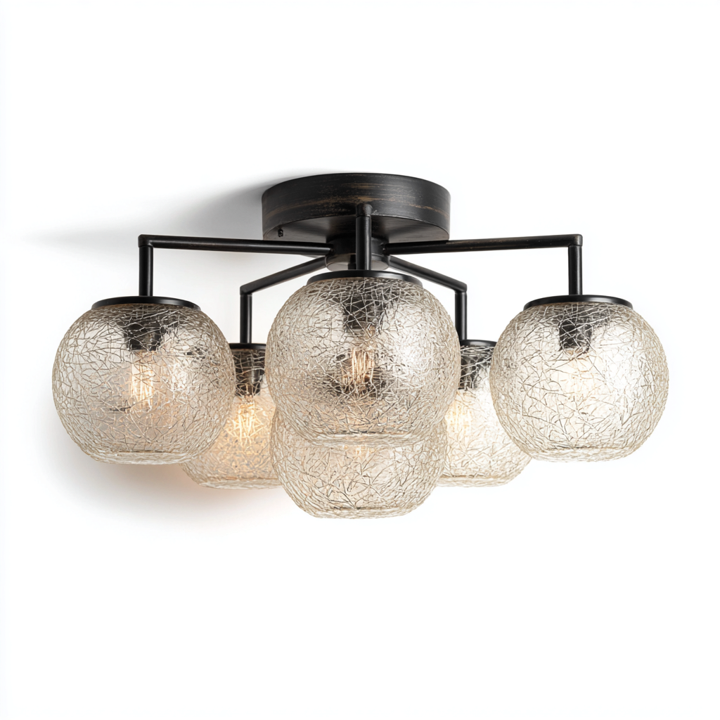 Ce plafonnier en métal noir et verre translucide texturé apporte une esthétique contemporaine et un éclairage raffiné à votre intérieur. Sa structure géométrique et ses diffuseurs en verre craquelé créent un jeu de lumière subtil, idéal pour un salon ou une chambre.