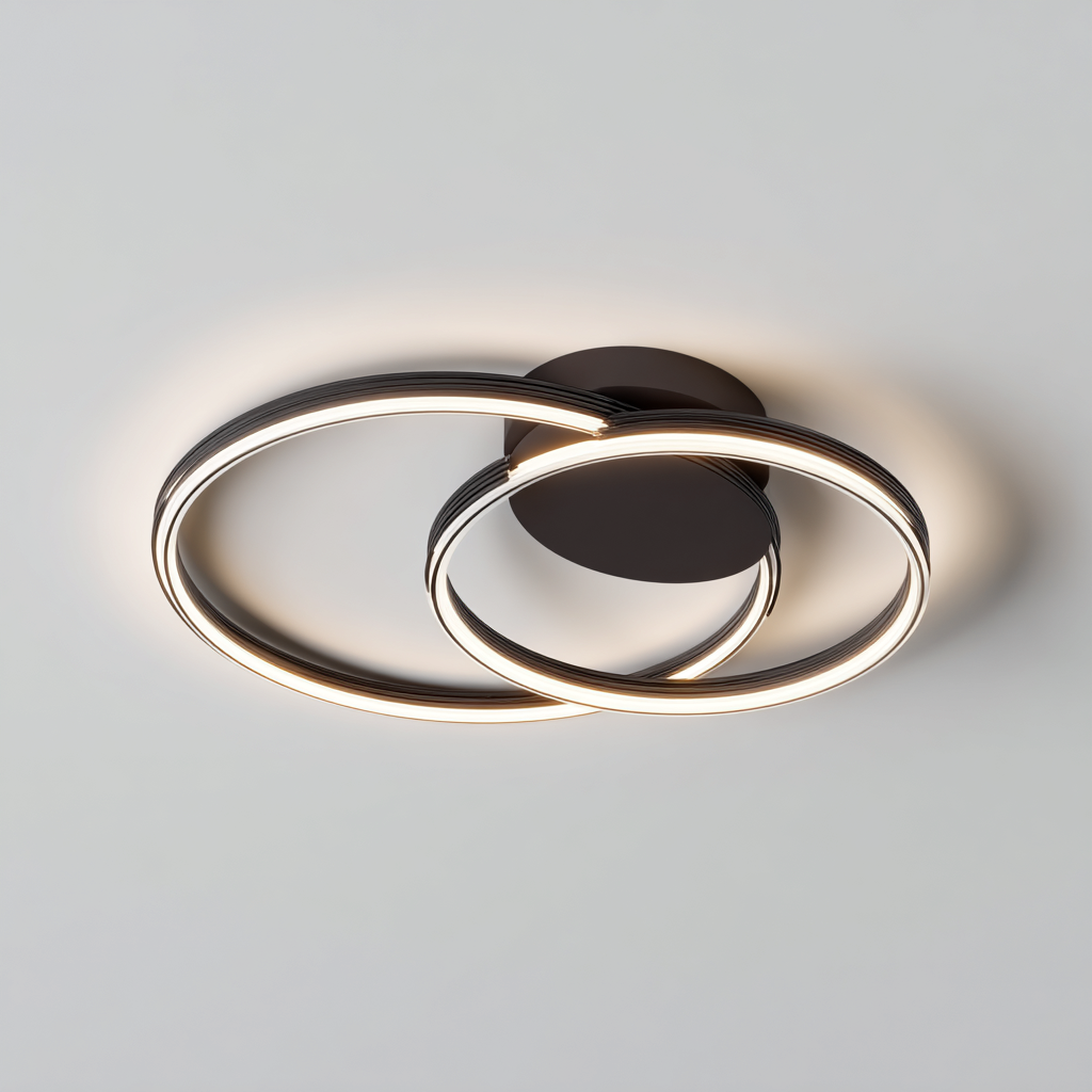 Ce plafonnier LED au design contemporain utilise deux anneaux lumineux entrelacés, offrant un effet visuel moderne et une lumière homogène adaptée au salon ou à divers espaces intérieurs.