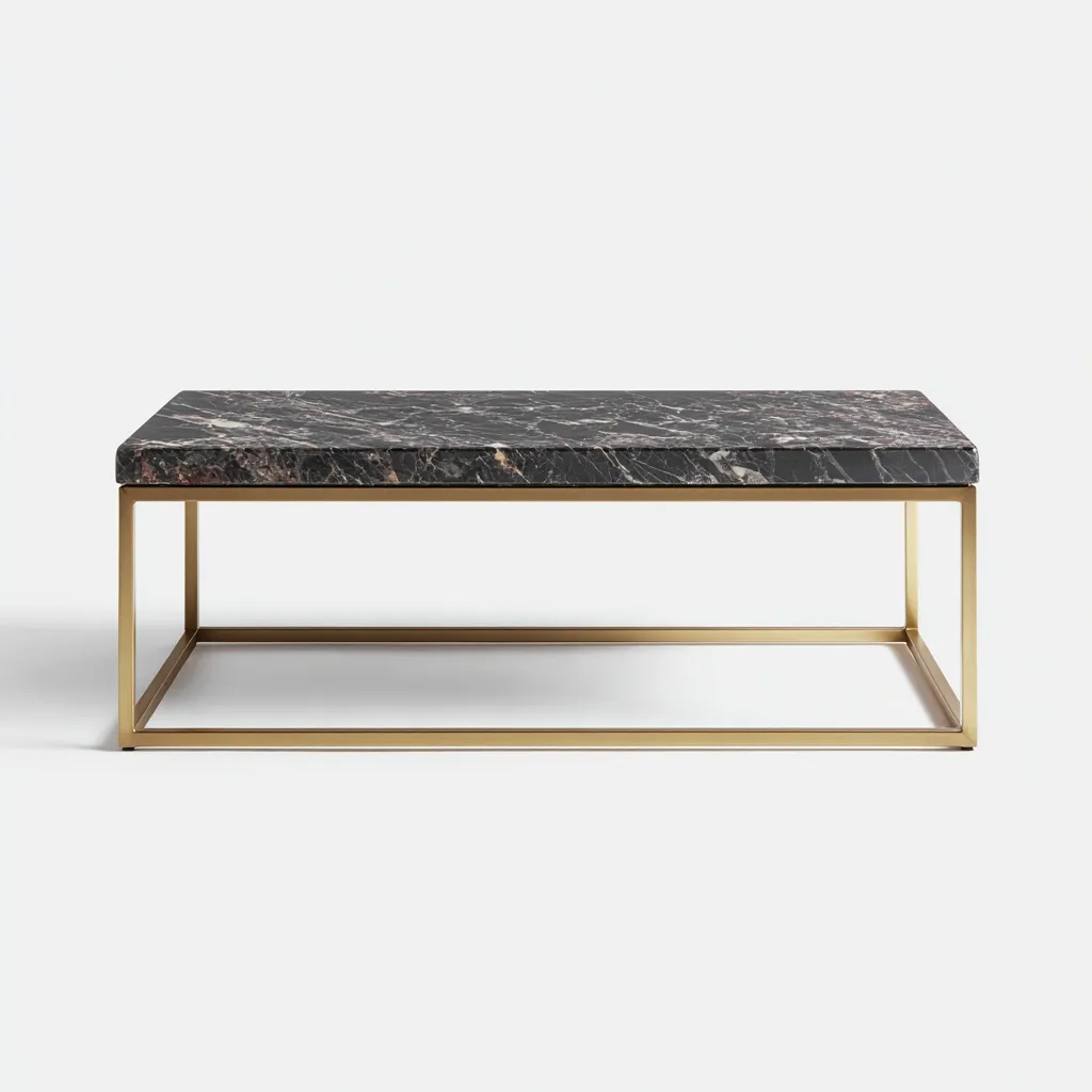 Cette table basse au design contemporain associe un plateau en marbre noir à une structure métallique dorée, créant une esthétique élégante et raffinée adaptée au salon. Ses lignes géométriques ajoutent une touche moderne à tout intérieur.