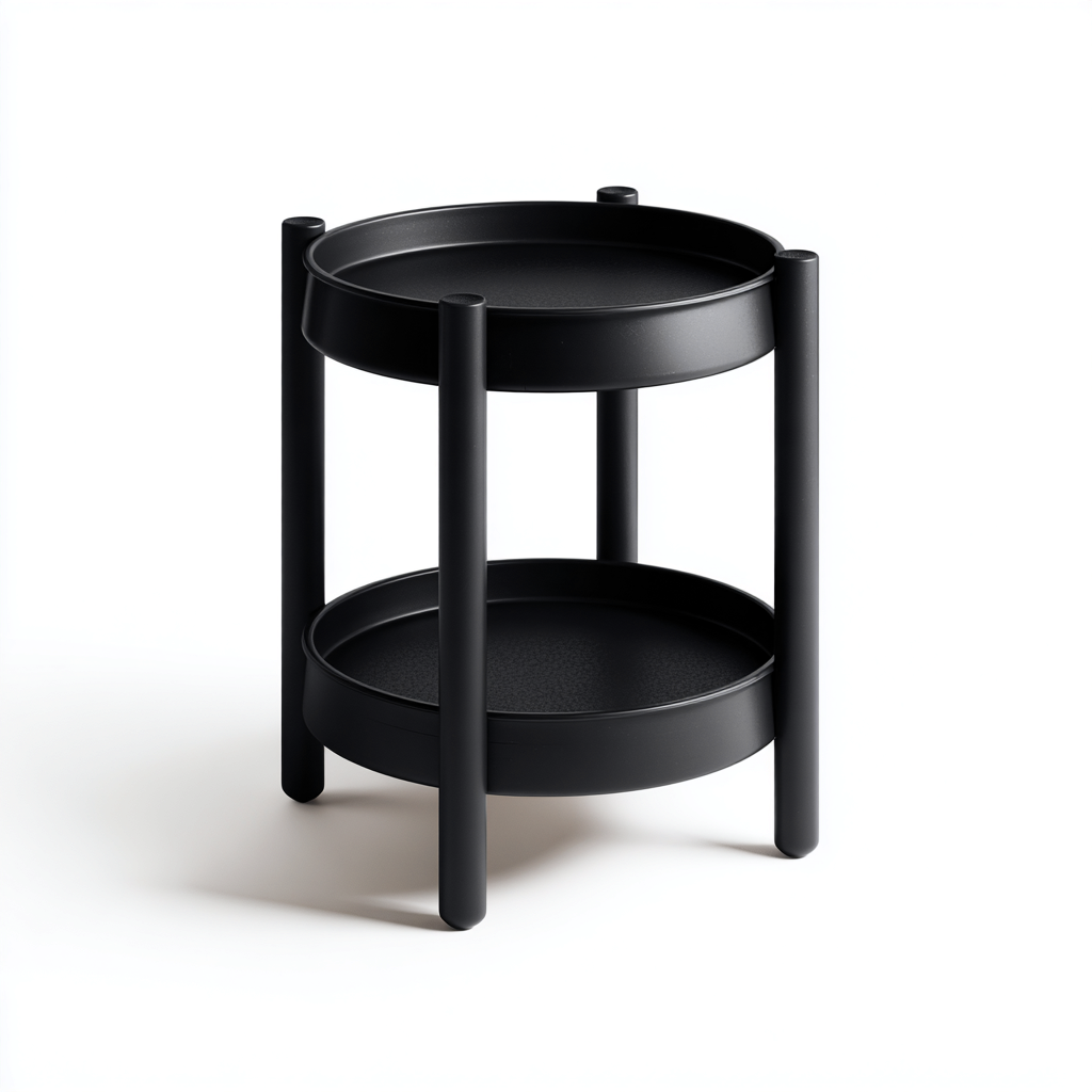La table est entièrement réalisée en métal thermolaqué noir, garantissant une bonne résistance aux intempéries et à l'usure. Les plateaux ronds légèrement relevés assurent une meilleure stabilité des objets.