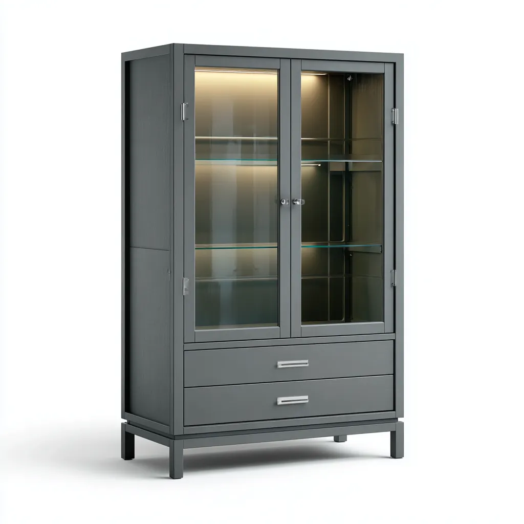 La structure est réalisée en panneau bois finition gris, dotée de portes vitrées robustes et d'étagères en verre. Un éclairage interne apporte une mise en valeur subtile du contenu.